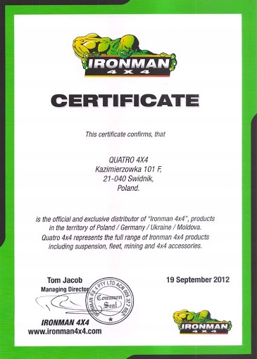 Informacje dodatkowe: Ironman 4×4 jest Australijską firmą produkującą wzmocnione zawieszenia do samochodów terenowych od przeszło 50 lat. Zawieszenia Ironman 4×4 zostały stworzone w najbardziej wymagającym terenie na świecie – w Australii. Ironman 4×4 należy do czołówki światowych producentów części do samochodów terenowych.