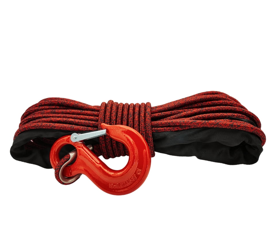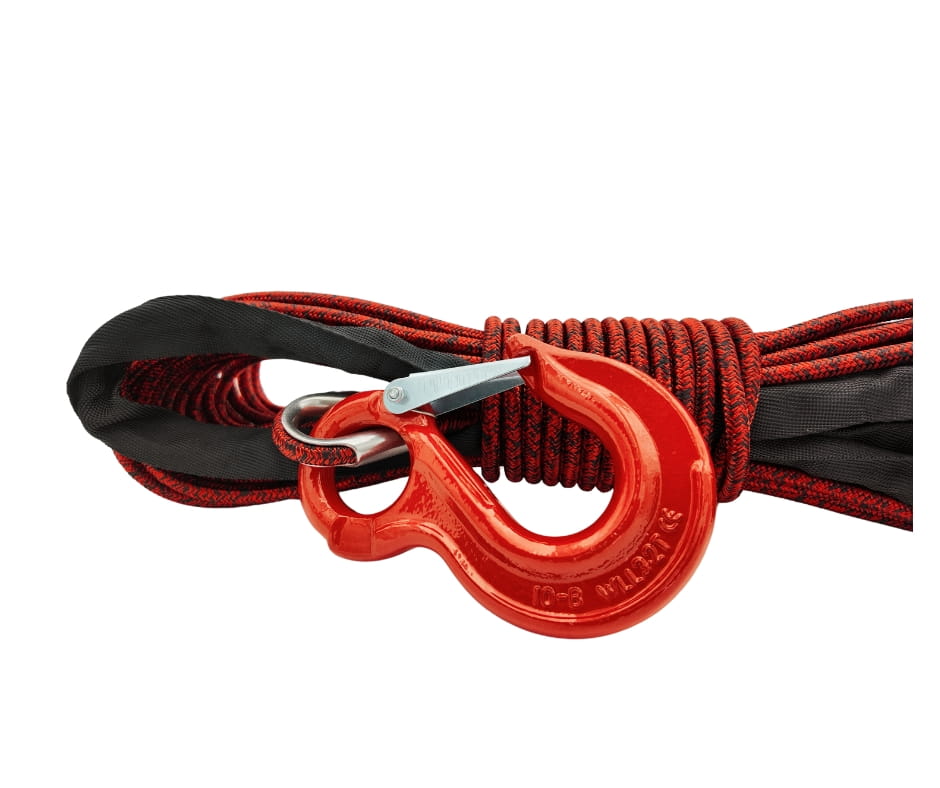 - Wytrzymały hak oczkowy 3.15T – jest to hak przeznaczony głównie do lin syntetycznych, nie ma możliwości żeby wypadł oraz swobodnie można go poruszać w kauszy. Warto na to zwrócić uwagę ponieważ dużo lin ma w zestawie zwykły hak sworzniowy, który ma mniejsze ucho, przez co jest bardziej kłopotliwy w użytkowaniu.