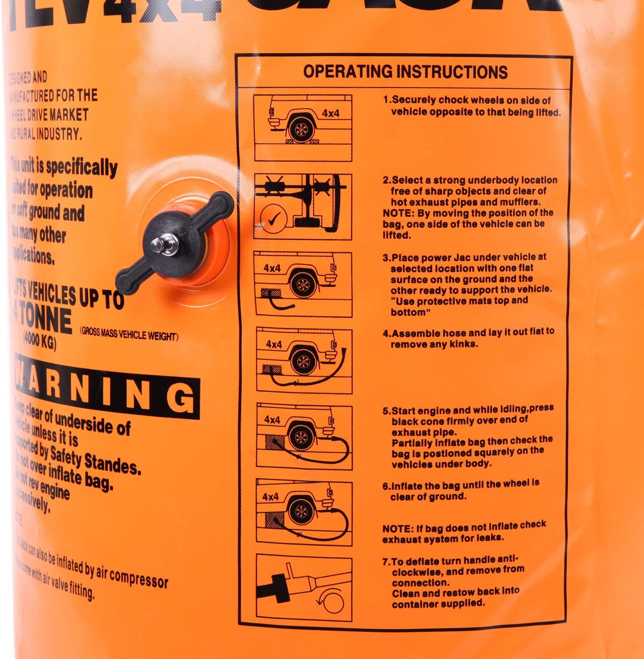 Silna konstrukcja podnośnika Air Jack jest wysoce odporna na wybuchanie, nawet w przypadku przekłucia. Po złożeniu zajmuje niewiele miejsca w samochodzie. W zestawie wygodna torba do przechowywania. Podnośnik Air Jack jest niezbędny w nagłych wypadkach oraz świetnie spisuje się na trudnych podłożach.