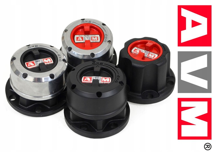 Nowe, firmowo zapakowane – ręczne (manualne) sprzęgi piast przednich kół marki AVM, jednej z najbardziej znanych i najlepszych firm na świecie produkujących sprzęgiełka, do samochodów terenowych: